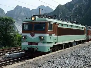 The Shaoshan 3 (Chinese: 韶山三) is a type of electric locomotive used on the People's Republic of China's national railway system. This locomotive was the third Chinese electric main line locomotive, built by the Zhuzhou Electric Locomotive Works. The power supply was industrial-frequency single-phase AC, and the axle arrangement Co-Co.