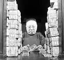 The impact of the war on the social and economics conditions of China had been brutal. An estimated 20 to 25 million Chinese were killed in fighting, massacres, and man-made or natural disasters.[167] By 1946, Chinese industries operated at 20 percent capacity and had 25 percent of the output of pre-war China.[168] The influx of cheap American goods forestalled any recovery. In order to coordinate the war effort, the Nationalist government had taken over more than 70% of Chinese industry, a dramatic increase from the 15% it owned before the war.[169] This consolidation of wealth in the regime's hands contributed to the pervasive problem of corruption.[170] The Nationalist currency had been undergoing hyperinflation since the beginning of the war.[171] By 1945, retail market prices had reached 3,000% of their 1937 levels.[171] This problem was compounded by the presence of numerous other currencies printed by the Japanese, Communists, and other local authorities.[172] The Nationalist Government failed to curb inflation after the Japanese surrender and continued to print more currency to pay for the civil war.[lower-alpha 3][173][174] Hyperinflation reduced the real wages of peasants, workers, and especially soldiers, and destroyed the savings of the upper-middle class that was Chiang's base of support.[174]