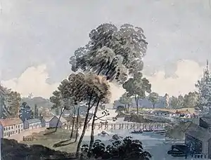 A fort was built in 1791 (at the present day site of Kings Bridge park) to defend the south end of the Portage Road and the King's Bridge (discussed in the Transportation section). This was also known as Fort Welland and consisted of a log blockhouse surrounded by a stockade.[2]