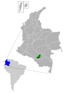 The Chiribiquete emerald is restricted to the Serranía de Chiribiquete, a range of flat-topped mountains straddling south central Colombia's Guaviare and Caquetá departments. There it primarily inhabits the open scrub and savanna of the range's middle and upper elevations. It also occurs in the forest at somewhat lower elevations but shuns the lowlands that surround the mesas.[6][5] In elevation it ranges between 800 and 1,600 m (2,600 and 5,200 ft).[1]