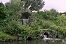 A lake was created around 1727 by widening the Bollo Brook. The excess soil was then heaped up behind William Kent's cascade to produce an elevated walkway for people to admire the gardens and a view of the nearby River Thames. A gateway designed by Inigo Jones in 1621 at Beaufort House in Chelsea (home of Sir Hans Sloane) was bought and removed by Lord Burlington and rebuilt in the gardens at Chiswick in 1738.[72]