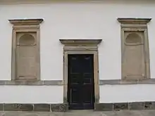 The brick-built Villa's facade is faced in Portland stone, with a small amount of stucco. The finely carved Corinthian capitals on the projecting six-column portico, carved by John Boson, are derived from the Temple of Castor and Pollux in Rome.[56] The inset door, projecting plinth and 'v'-necked rusticated vermiculation (resembling tufa) were all derived from the base of Trajan's Column. The short sections of crenellated wall with ball finials which extend out either side of the villa were symbolic of medieval (or Roman) fortified town walls, and were inspired by their use by Palladio at his church of San Giorgio Maggiore in Venice and by Inigo Jones (1573–1652) (Palladio produced woodcuts of the Villa Foscari with crenellated sections of walls in his I quattro libri dell'architettura in 1570, yet they were never built). To reinforce this link, two full-length statues of Palladio and Jones by the celebrated Flemish-born sculptor John Michael Rysbrack (1694–1770)[lower-alpha 1] are positioned in front of these sections of wall. Palladio's influence is also felt in the general cubic form of the villa with its central hall with other rooms leading off its axis. The villa is a half cube of 70 feet (21 m) by 70 feet (21 m) by 35 feet (11 m).[57] Inside are rooms of 10 feet (3.0 m) square, 15 feet (4.6 m) square and 15 feet (4.6 m) by 20 feet (6.1 m) by 25 feet (7.6 m). The distance from the apex of the dome to the base of the cellar is 70 feet (21 m), making the whole pile fit within a perfect, invisible cube. However, the decorative cornice at Chiswick was derived from a contemporary source, that of James Gibbs's cornice at the Church of St Martin-in-the-Fields, London.