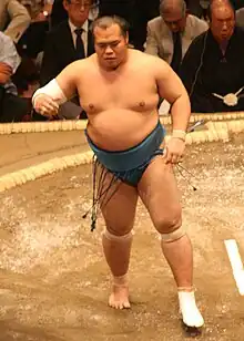 He made a good start to the May 2009 tournament but was forced to pull out after damaging knee ligaments in his Day 4 defeat to Kisenosato.[1] He was demoted back to the jūryō division for July 2009 as a result. He was unable to secure an immediate return to the top division, scoring only 7–8 in the July tournament. In September 2009 he withdrew once again after winning only three bouts in the first ten days, and he remained in jūryō after that.