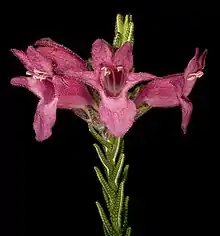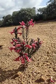 Chloanthes coccinea is a small, spreading, much branched shrub with stems in cross section more or less circular. The leaves are arranged opposite, narrowly linear, almost needle-shaped due to rolled margins, 0.8–3 cm (0.31–1.18 in) long and 2–4 mm (0.079–0.157 in) wide, stiff, leathery, distinctly blistered on upper surface, densely woolly on the underside. The bracts are 2–3.5 mm (0.079–0.138 in) long, pedicel 2–3.5 mm (0.079–0.138 in) long with branched hairs, calyx 5 lobed, 4.5–7 mm (0.18–0.28 in) long, moderately crowded with branched hairs and a blistered surface. The scarlet, red or deep pink corolla 17–27 mm (0.67–1.06 in) long, with branched hairs in the throat, four stamens, style 13–20 mm (0.51–0.79 in) long, glandular with soft hairs on the outside, mostly smooth on the inside. The larger anterior lobe has small hairs, the two upper lobes oblong to egg-shaped, rounded at the apex, 3–6 mm (0.12–0.24 in) long, 2–5 mm (0.079–0.197 in) wide at the base. The two lower lobes oblong to egg-shaped, 4–8 mm (0.16–0.31 in) long and 3–5 mm (0.12–0.20 in) wide at the base. The floral tube almost cylindrical near the base. Flowering occurs from July to November and the fruit roughly spherical, 3–5 mm (0.12–0.20 in) long and 3–4 mm (0.12–0.16 in) in diameter and soft hairs on the surface.[2][3]