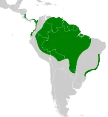 The green-and-rufous kingfisher's nominate subspecies has by far the larger range of the two, and has three separate parts. The first is from southeastern Nicaragua through the Caribbean slope of Costa Rica and much of Panama's width into Colombia. The second extends from eastern Colombia east through Venezuela and the Guianas into eastern Brazil and south through most of Amazonian Brazil, Ecuador, Peru, Bolivia, and Paraguay. The third section of its range is along a narrow strip of southeastern Brazil from Bahia south to Santa Catarina. Subspecies C. i. chocoensis is found in western Colombia and northwestern Ecuador.[11][12] An undocumented sight record in Argentina leads the South American Classification Committee of the American Ornithological Society to class the species as hypothetical in that country.[4]