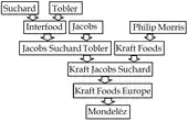 In 1970, Suchard merged with Tobler to become Interfood.[12] In 1982, Interfood was acquired by Klaus Johann Jacobs, and became part of the company Jacobs Suchard.[13][14] In 1987, the Suchard company acquired 66% of the shares of the Côte d'Or chocolate company.[15] In 1990, Philip Morris, also based in Neuchâtel, announced that they would buy Jacobs Suchard.[16] In 1993, Philip Morris combined Kraft General Foods Europe and Jacobs Suchard AG, renaming it Kraft Jacobs Suchard.[17] Chocolat Suchard was then merged with another Philip Morris purchase, Terry's of York later in 1993 to form the Terry's Suchard subsidiary.[18][19] It spun off its chocolate and confectionery brands as Mondelez International as of 2012.[20] The Suchard factory in the Serrières Valley is no longer used for production. Mondelez moved production to the Toblerone factory in Bern in the 1990s.[21] In 2015, Mondelez opened a new production line for Milka and Suchard chocolates at its plant in Bludenz, Austria.[22]