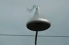 Chocolate Avenue is known for its street lamps that are shaped like Hershey's Kisses.[7][8] These unique lamps were designed by engineers with the Line Material Company and manufactured using a process called aluminum metal spinning in 1963.[9] Some of the kisses are shown as being wrapped, and some as unwrapped, alternating between these two designs.[10][11][12] These lamps can also be found on Park Avenue. In 1990, the need to replace the wrappers for the lamps became noticeable.[13]