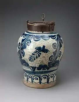 The vessel's opening is slightly narrower than its base. Its midsection bulges out just below the neck and tapers in a few inches from the bottom. The bottom edge does not have any glaze on it leaving the naked clay exposed. The body of the vessel is covered in a white glaze base and is decorated with hand-painted designs in varying opacities of a deep rich blue. The designs are placed in a repeating motif four times around the bulging middle of the vessel. Each contains a mix of swirls, flowers, branches, and scallop designs. In the center of each motif is a bird with a long tail. Over the neck of the vessel, a lid made of iron is placed. The lid's top is decorated with organic leaf filigree and has a key sticking out of it. The top is attached with an iron hinge to the collar of the neck.