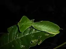 The hooded mantis is also called the leaf mantis or leaf-mimic mantis because it mimics leaves.[3] Like most other mantids, it is an ambush predator. C. strumaria is a chlorophyll-green colour and has a uniquely shaped hood;[4] its wings have leaf-like veins that add to its perfect camouflage. It also has colorful patterns on the underside of its prothorax.