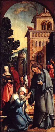 Christ taking leave of his Mother is a subject in Christian art, most commonly found in Northern art of the 15th and 16th centuries. Christ says farewell to his mother Mary, often blessing her, before leaving for his final journey to Jerusalem, which he knows will lead to his Passion and death; indeed this scene marks the beginning of his Passion.[1] In early versions just these two figures are usually shown, at half-length or less.