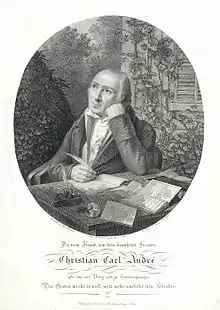 Christian Carl André was born on 20 March 1763 in the German town of Hildburghausen.[1] He studied at the University of Jena,[2] and worked as a teacher in Eisenach and at the Schnepfenthal Salzmann School in Gotha.[1] Then from 1798 to 1820 he lived in Brno, then within the Habsburg empire, where he headed the Evangelical Lutheran school; published the newspaper Patriotisches Tagebuch (Patriotic Notebook);[1] and edited a weekly journal Oekonomische Neuigkeiten und Verhandlungen (Economical News and Essays).[3] During this period he was a leading figure in the Moravian Agricultural Society, promoting applied scientific research particularly in the field of sheep-breeding.[3] He then moved to Stuttgart, where he published the Landwirtschaftliche Zeitschrift (Agricultural Journal) and acted as an adviser to the ruler of Württemberg.[1] He died on 19 July 1831.[1]