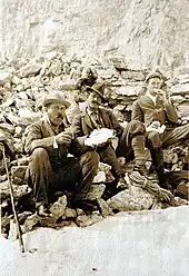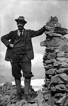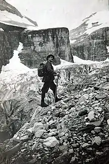 Christian Kaufmann made additional climbs in 1902 that deserve mention. On May 22, he and Christian Häsler guided Walter Weston (1861-1940) and his wife Francis (1872–1937) to the summit of Mt. Stephen; both Westons were experienced mountaineers and are credited with introducing mountain climbing in Japan during the late-nineteenth century.[57] Walter commented that Kaufmann's "strength & skill are only equalled by his care & attention. He well deserves the place he has gained at the top of the tree of his profession."[58] Later in the season (September 1902), Kaufmann took George B. Dorr[59] to the top of Mt. Stephan and across Abbott's Pass. Dorr was an active conservationist and noted philanthropist who is credited with the establishment of Acadia National Park.