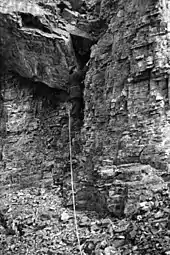 "Drawn out for one long hour of concentrated tension were the successive experiences of helpless groping in the dark depths for something to rest a foot upon, of blind search all over the chilled rocky surface for a knob or tiny crack where the numbed fingers might find another hold, of agonizing doubt as to their stability when found, of eerie thrill and sickening sensation when the long-sought support crumbled beneath the stress and hurtled downward into the blackness of space, whilst the hollow reverberations of its fall reechoed through the silence."[53]