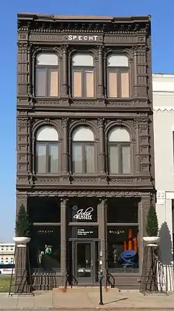 Designed by local architects Dufrene and Mendelssohn in 1884, the three-story Specht Building was modeled in the Italian Renaissance Revival Style. This was a popular style for cast-iron facade buildings. Christian Specht's company, the Western Cornice Works, manufactured the facade. The company was a manufacturer of galvanized iron cornices, finials and other metal building products.[4] Today the building is renowned for its artistic value by representing this period's usage of iron.[5]