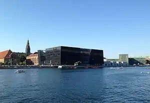 The complex known as Tjæreborg, lit. tar castle/fortress from its dark appearance with a facade of green marble and copper,[2] (Christians Brygge 6) was built by the architects Thomas Havning and Svenn Eske Kristensen from 1961 to 1968.[3] It houses the Ministry of Justice.