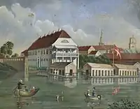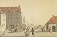Back when the new quay was constructed, Langebro Bridge was located at the end of Vester Voldgade. Next to the bridge stood the House of the Drowned (Druknehuset). Built in 1806, it was used for storing of unidentified victims of drowning while they awaited identification. Rysensteen Public Sea Bath was located at Rysensteen Bastion. Another building located at the new street was the royal brewery, Kongens Bryghus, which had originally been based in a former military structure on Slotsholmen but moved to a new building on the other side of Frederiksholms Kanal in 1771.