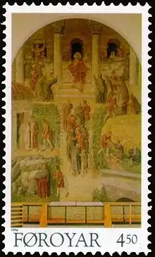 The nave is centred around the imposing altarpiece of the Great Banquet, which is seven metres high. The painting had existed long before the church was built. Peter Koch is said to have made the painting his focal point in designing the church. It was created by the Danish church artist Joakim Skovgaard in 1901 as a fresco for the cathedral church in the Danish city of Viborg. Due to the moisture of the walls of the cathedral church, there was the risk that the piece could be destroyed. It was therefore put on canvas in 1910 and placed in the National Museum of Denmark so that it could later be made available to Koch for Christian's Church.