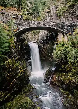 The Christine Falls Bridge is a reinforced concrete arch bridge in Mount Rainier National Park, spanning Van Trump Creek at Christine Falls. The bridge was built in 1927–1928 by contractor J. D. Tobin of Portland, Oregon, who built the Narada Falls Bridge at the same time. The arch has a three-centered profile and spans 56 feet (17 m). The bridge is 30 feet (9.1 m) wide. It was faced with rubble stonework and is an example of National Park Service Rustic design.[2]