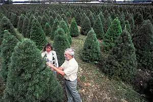 In 2002, in the United States, 21,904 Christmas tree farms covering 447,000 acres (1,809 km2) of cropland accounted for the 20.8 million Christmas trees cut.[8] Of those farms, 686 harvested 100 acres (0.4 km2) or more, which accounted for over 196,000 acres (793 km2) of the total area of trees harvested. That same year, there were only three U.S. Christmas tree farms with more than 10,000 acres (40 km2) of cropland in production.[8] The total U.S. crop in 2004 was valued at $506 million with $143 million attributed to the nation's leading producer in 2004, Oregon.[9] Oregon was followed in production numbers by North Carolina, Washington, and Michigan.[10] In 2012, 24 million trees were sold at a retail value of over $1 billion.[11]