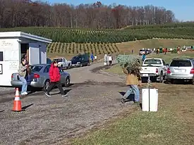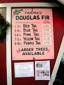 One appeal of Christmas tree farms to growers is that it can be a profitable way to use low quality farmland, though this trend is changing within the industry.[28][29] Christmas tree farms can turn a profit in as little as six years, and though some overhead in equipment and labor does exist Christmas tree production requires only small amounts of up-front capital.[28] Each tree can cost land owners $5–10 from the time it is planted as a seedling until it is harvested as a mature Christmas tree; that cost includes land costs, and costs accumulated through the growing process.[30] In the early 21st century, Christmas tree farmers typically got annual returns of between $600–1,000 per acre of trees planted.[30]