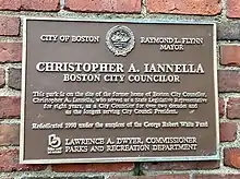 He was survived by four children, three of whom worked in politics.[7] Christopher Iannella Jr. has been a member of the Massachusetts Governor's Council since 1993.[8] Richard P. Iannella was an at-large City Council member from 1994 through 1996 and Suffolk County Register of Probate from 1997 to 2011.[9][10] Suzanne Iannella was a member of the Boston Licensing Board and the state Alcoholic Beverages Control Commission as well as an unsuccessful candidate for city council in November 1997 and November 1999.[7][11][12] The room in Boston City Hall where the City Council meets is named the Christopher A. Iannella Chamber in his honor.[13]