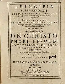 He graduated as Doctor of Law in 1598; and in 1610 became professor of law at Tübingen. Among his pupils was Johannes Valentinus Andreae.[4] Besold was one of the influences on Andreae's later Rosicrucian writings, along with Tobias Hess.[5] His advice was frequently sought in juridical questions by the civil administration.