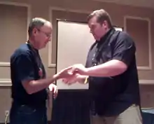![]() General Keith Alexander (left) offers Chris Hadnagy the NSA Director's Challenge Coin at DEF CON 20. | |