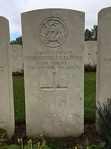 One night in 1917, while on sentry duty, Alexander broke his leg. The injury was assumed to be just a sprain and was not properly treated for more than two weeks. He was then sent back to Britain, and spent his convalescence in Monmouthshire, Wales. After more training until his leg was fully healed, Alexander was sent back to France. He was mortally wounded during the Battle of Broodseinde on 4 October 1917 and died the following day. He is buried in Hooge Crater Cemetery, located on the Ypres Salient in Belgium.