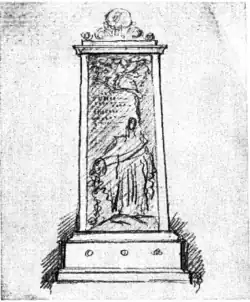 In sculpting the figure of Charity, Saint-Gaudens employed Davida, his favorite model, to pose for him,[2] and a preliminary model of the relief used Davida's face, though this was later changed for the finished product.[7] Additionally, early designs for the memorial would have included a relief of Magee's face in profile at the top of the stele, though this was later replaced with a simple anthemion.[2] While Saint-Gaudens had originally intended to carve the relief directly into the granite stele, he opted to instead use bronze after considering the effect that the air pollution in Pittsburgh would have on the memorial.[8] The design of the stele is derivative of some earlier works of Saint-Gaudens, including the plaque Amor Caritas (which was acquired by the Musée du Luxembourg in Paris) and an unused stele design for a memorial to Whistler.[2][5] The Whistler memorial design, entitled Painting, bore a very strong resemblance to the Magee memorial stele, though with the main figure holding a palette and paintbrush instead of a cornucopia.[5] The overall style of the memorial, with a main central effigy surrounded by a background of stylized lettering and detail, is also indicative of a style that Saint-Gaudens had introduced and popularized in the United States, while the layout of the memorial's base, which saw a central stele emerge from the center of an exedra, was one which Saint-Gaudens had developed with White and can be seen in some of their earlier collaborations, such as the statue of David Farragut in New York City.[9]