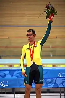 In a 2008 interview, he said of this action: "I already had my gold medal. It's what you do in a team. Peter deserved his chance on the podium."[6] He won two further gold medals in the Men's Road Race / Time Trial Bicycle CP Div 4 and Men's Individual Pursuit Bicycle CP Div 4 events at the 2004 Games.[7] At the 2008 Beijing Games, he won a gold medal in the Men's Individual Pursuit CP4 event, a silver medal in the Men's Individual Time Trial CP4 event and a bronze medal in the Men's 1 km Time Trial CP4 event.[7] The year before these Games, he had had back surgery and then was struck down by a car.[6]