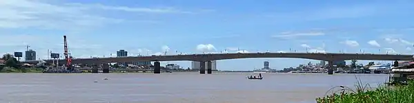 The Chroy Changva Bridge (also known as the Cambodian-Japanese Kizuna Friendship Bridge) is a 709-meter bridge that crosses the Tonle Sap River in Phnom Penh, originally built in 1963, with Japanese aid. Severely damaged during the civil war in 1972 and 1973, it remained closed until it reopened on the 26th of February 1994 [1] About 10 km north of it there is another bridge the Prek Kdam Bridge, then the Prek Pnov Bridge and no more bridges on the Tonle Sap, a temporary bridge should open in April 2018, the construction of a concrete bridge should start just after that.[2]
