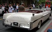 The cars were based on stretched (to 147.5 in) 1952 Imperial Crown Limousine chassis and carried completely custom bodywork with the exception of the 1951 Imperial grille, bumpers and front and rear trim. Almost uniquely for a postwar car, they were dual-cowl phaetons, with separate front and rear passenger compartments, each with its own windshield. There were no side windows, and a lightweight Dacron convertible top covered only the rear compartment during inclement weather, and was manually retracted beneath the rear-hinged deck lid when not in use. The rear doors were suicide doors and had no exterior handles.[2] In 1940, Chrysler built six limited production cars with the same approach to uniqueness called the Chrysler Newport Phaeton also using an Imperial chassis.