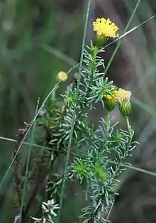 The plant has slender stems with dense leaves. The leaves are narrow or acicular with stiff hairs on the edges and stand semi-erect. The flower heads are yellow and are solitary on the tips of the branches without ribbon flowers. They are surrounded by rows of narrow bracts. The shrub blooms from September to January.[3]