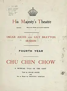 Chu Chin Chow is a musical comedy written, produced and directed by Oscar Asche, with music by Frederic Norton, based (with minor embellishments) on the story of Ali Baba and the 40 Thieves.[1] The piece premièred at His Majesty's Theatre in London on 3 August 1916 and ran for five years and a total of 2,238 performances (more than twice as many as any previous musical), a record that stood for nearly forty years until Salad Days.[2][3] The show's first American production in New York, with additional lyrics by Arthur Anderson, played for 208 performances in 1917–1918, starring Tyrone Power.[4] It subsequently had successful seasons elsewhere in America and Australia, including in 1919, 1920, 1921 and 1922.[1]