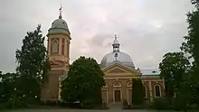 The church was built to its current location in 1837 and is designed by the Italian-born Carlo Bassi.[3] The location was moved due to lack of space. Previously on the spot of the church there was a secret site for the pre-Christian pagans whose so called sacrificial stone is still visible at the church's front yard.[4]