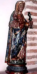 Of late Gothic style and great artistic merit, her blonde hair and blue eyes make her unique in the region. Her gold-trimmed mantle still retains the original polychromy. It is of French origin, possibly from the city of La Rochelle,[9] and comes from the old convent of San Basilio, where it had an altar in the main chapel, on the Gospel side. Legend[10] has it that once in Cuéllar it was taken to the Dukes of Alburquerque, who, after drawing lots, deposited it in San Basilio.[11]