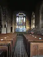 The interior walls were stripped of plaster in the late 19th century. The nave and aisles are separated by Perpendicular four-bay arcades with moulded arches and piers with four shafts. At the West end the tall tower arch dates to the earliest tower of about 1300, while the remainder of the church tower dates to 1720. St Andrew's is built of coursed dark ironstone rubble, while the tower is of grey ashlar on an ironstone base. The church has limestone dressings. The stained glass in the East window was installed in 1877, while the chancel window in the South West depicting the Crucifixion is of 1882 and is by Lavers, Barraud and Westlake. The middle window on the South of the chancel is by Charles Eamer Kempe.[1][7][8]