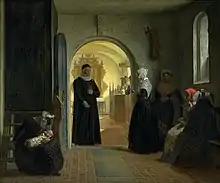 The rite became the subject of a good deal of misunderstanding, since many commentators and preachers, in describing its scriptural antecedents, did not explain the concept clearly. Pope Gregory I as early as the 6th century protested against any notion that defilement was incurred by childbirth and recommended that women should never be separated from the church in case it was seen as such.[7] As a blessing given to mothers after recovery from childbirth, "it is not a precept, but a pious and praiseworthy custom, dating from the early Christian ages".[8] David Cressy points out that the ceremony acknowledged the woman's labours and the perils of childbirth. At the conclusion of a month after childbirth, women looked forward to churching as a social occasion, and a time to celebrate with friends. For men it marked the end of a month during which they had to take care of the domestic affairs, commonly referred to as the "gander month".[9] In thirteenth-century France the rite focused on the woman's role as wife and mother.[10]