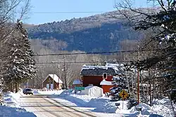 The village is located in a fairly flat valley surrounded by a mountainous area of the Laurentian Hills that are dominated by mixed forest.[1]