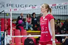 Ciara Kathleen Michel (born 2 July 1985) is a British/American volleyball player who plays as a middle blocker.[3] Born in Taunton, Somerset Michel learned to play volleyball in Miami, Florida after her parents moved there when she was aged 10.[4] In Miami she attended Palmer Trinity School, and graduated in 2003. Here she became a star volleyball player and has been credited with starting a rich volleyball tradition at the school. She later became a student athlete at the University of Miami from 2004 to 2008, where she was captain, and still holds the records for most career blocks.