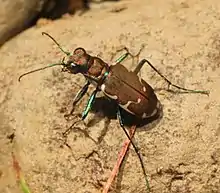 Cicindela ancocisconensis, known generally as the Appalachian tiger beetle or boulder beach tiger beetle, is a species of flashy tiger beetle in the family Cicindelidae.[1][2][3][4] It is found in North America. The beetle's long, slim body are favorable for hunting their prey. This consists of identifying their prey, a long pursuit, and finally catching their prey. Their careful, precise method allows them to pursue creatures from sedentary to elusive.[1][5]