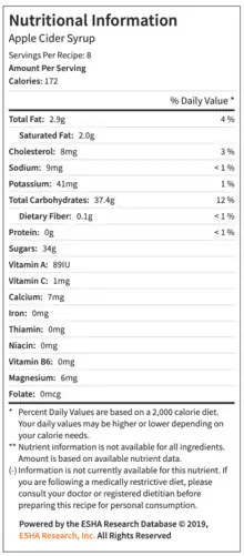 Cider syrup contains total fat 2.9g, cholesterol 8mg, sodium 9mg, potassium 41mg, total carbohydrates 37.4g, Sugars 34g, Vitamin A 89IU, Vitamin C 1mg, Calcium 7mg and total calories 172 per serving.[6] The cider syrup also contains the high pectin content of apple.[5]