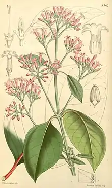 Cinchona officinalis is a shrub or tree with rugose bark and branchlets covered in minute hairs. Stipules lanceolate or oblong, acute or obtuse, glabrous. Leaves lanceolate to elliptic or ovate, usually about 10 centimetres (3.9 in). long and 3.5–4 centimetres (1.4–1.6 in). wide; acute, acuminate, or obtuse tip; base rounded to attenuate; coriaceous, glabrous above and often lustrous; glabrous beneath or puberulent or short-pilose, especially on the veins. Inflorescences in terminal panicles, many-flowered; hypanthium with short coarse hairs; reddish calyx, glabrous or nearly so, with triangular lobes; pink or red corolla, sericeous, the lobes ovate, acute, the corolla tube being about 1 cm. long. Fruit is an oblong capsule, 1.5–2 cm. long, almost glabrous.[1][2]
