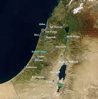 The Cisjordan corpus of Phoenician Iron Age hacksilber (hacksilver), dated between 1200 and 586 BC,[1] is the largest identified collection of pre-coinage silver in the ancient Near East. The corpus was identified by Christine Marie Thompson in 2003. The corpus is composed of 34 silver hoards found at 15 sites in ancient southern Phoenicia or modern Israel and Israeli-occupied territories, this area is termed "Cisjordan".[2] Significant hoards have been found at Tel Dor, Eshtemoa, Tell Keisan, Ein Hofez, and Akko.[3] The other hoards were found at Megiddo (see: Megiddo treasure), Bet Shean, Shechem, Shiloh, Gezer, Tel Miqne-Ekron, Ashkelon, Ajjul, Ein Gedi, and Arad.[2]