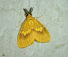 The moth is dull pale orange. The male sex has a strongly bipectinate (comb-like on both sides) antennae.[5]