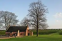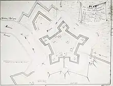 In 1629 the Dutch Republic conquered 's-Hertogenbosch after a famous siege. It spelled the end for Bastion Orthenpoort, and the Orthen Gate was demolished in 1635.[3] In 1637 construction of the citadel started.[4] The design was probably by Pieter Bilderbeeck, inspector of national fortifications.[1] He chose a regular pentagonal form with bastions with brick walls. This was a kind of ideal type of fortification, cf the Citadel of Lille. It got the name Fortress Willem Maria, after two children of Frederick Henry, Prince of Orange, conqueror of the city.