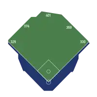 | Field size | Left field foul pole 329 feet (100 m)[7] Left field power alley 374 feet (114 m)[7] The "Angle" (left of CF to LCF) 409 feet (125 m) – 381 feet (116 m) – 387 feet (118 m)[7] Center field, straightaway 401 feet (122 m)[7] Right field power alley 369 feet (112 m)[7] Right field foul pole 330 feet (101 m)[7] ![]() |