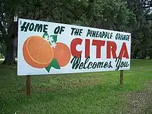 Citra is an unincorporated community in Marion County, Florida, United States. The community is part of the Ocala Metropolitan Statistical Area. Citra is known as the home of the pineapple orange,[1] (originally called the Hickory orange) a name coined in 1883 for an orange (fruit) with an aroma reminiscent of the pineapple.