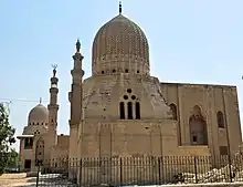 The Fatimid dynasty revived or reintroduced ancient Egyptian traditions of building monumental mausoleums and of visiting ancestors' graves, which subsequently changed the character of the cemeteries. One impetus for this was the presence of the tombs of a number of descendants of Muhammad and of 'Ali buried here earlier. These were especially important to the Shi'i version of Islam of which the Fatimids were adherents. The Fatimids even built three shrines which were intended to house the remains of Muhammad and of the first two Shi'a caliphs/imams, but the remains were never moved here.[1] A number of other Fatimid-era mausoleums survive today in the area between the Mosques of Ibn Tulun and of Sayyida Nafisa, such as the Mausoleum of Sayyida Ruqayya.[7] During this period, the name al-Qarafat al-Kubra ("Greater Qarafa") appears to have designated the vast cemeteries associated with Fustat, which may not have merged yet with the Abbasid-era cemeteries of al-'Askar and al-Qata'i.[1][8]