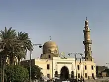 Directly south of the mosque, across the Salah Salem road, is the neighborhood of al-Qadiriya, centered around the street by that name. At its entrance are the remains of the Bab al-Qarafa, an old gate in the city walls giving access the Qarafa and which was rebuilt in the 15th century by Sultan Qaitbay.[7] It is now overshadowed by the Salah Salem bypass. A number of other historical mosques and monuments are in the area, including the Mausoleum and Zawiya of Shaykh Zayn al-Din Yusuf (dating from 1298 to 1299), on al-Qadiriya street, whose presence was probably an early catalyst for settlement in that area.[1] The cemetery on the eastern side of this neighborhood contains the remains of a cluster of monuments from the Mamluk era. They are architecturally impressive but have been partly destroyed over the years. They include the Mausoleum and Khanqah of Amir Qawsun (founded in 1335) and the so-called "Sultaniyya" mausoleum (believed to be dedicated to Sultan Hassan's mother, in the mid-14th century).[1][7]